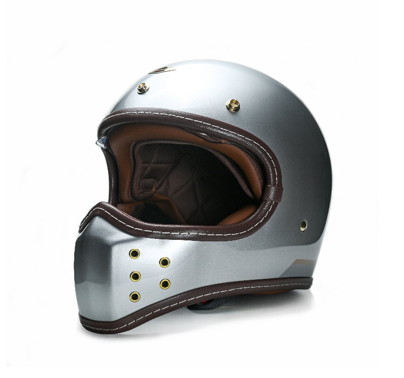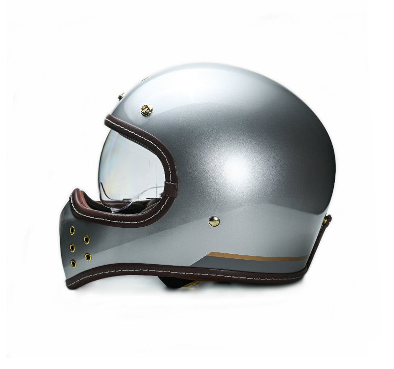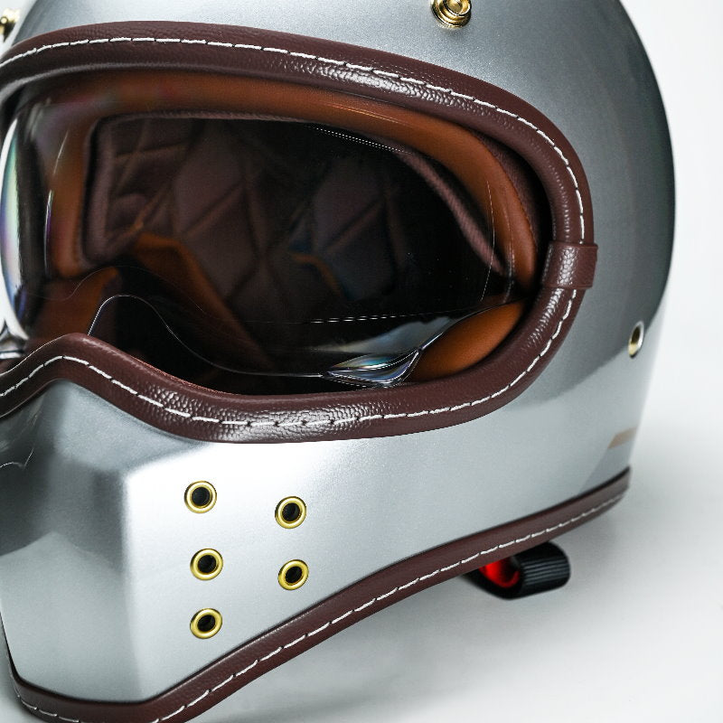 レザー調の縁取りとキャラメルブラウンの内装が、上品さと冒険心を巧みに調和させ、レトロな魅力をさらに引き立てます。独自の内蔵バイザー設計により、ライダーに快適な装着感と高い実用性を同時に提供します。